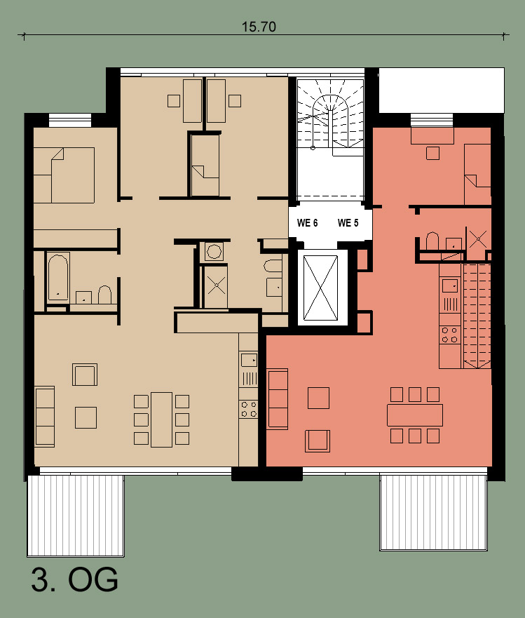 Neben 7 Etagenwohnungen gibt es 2 Maisonettewohnungen. Die Wohnungen haben